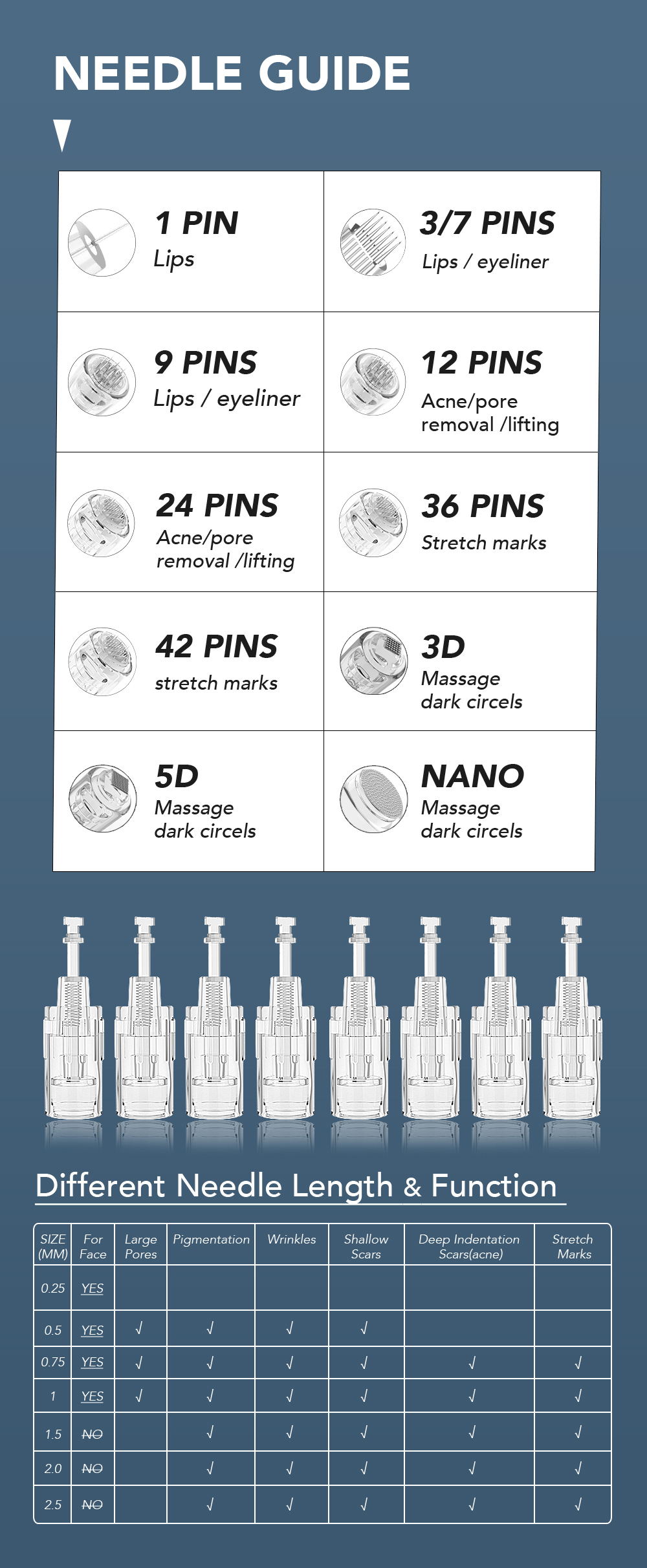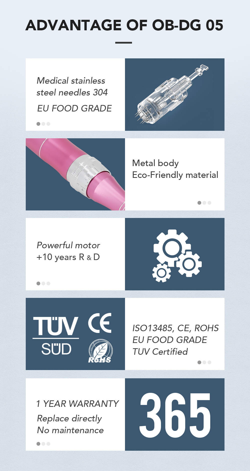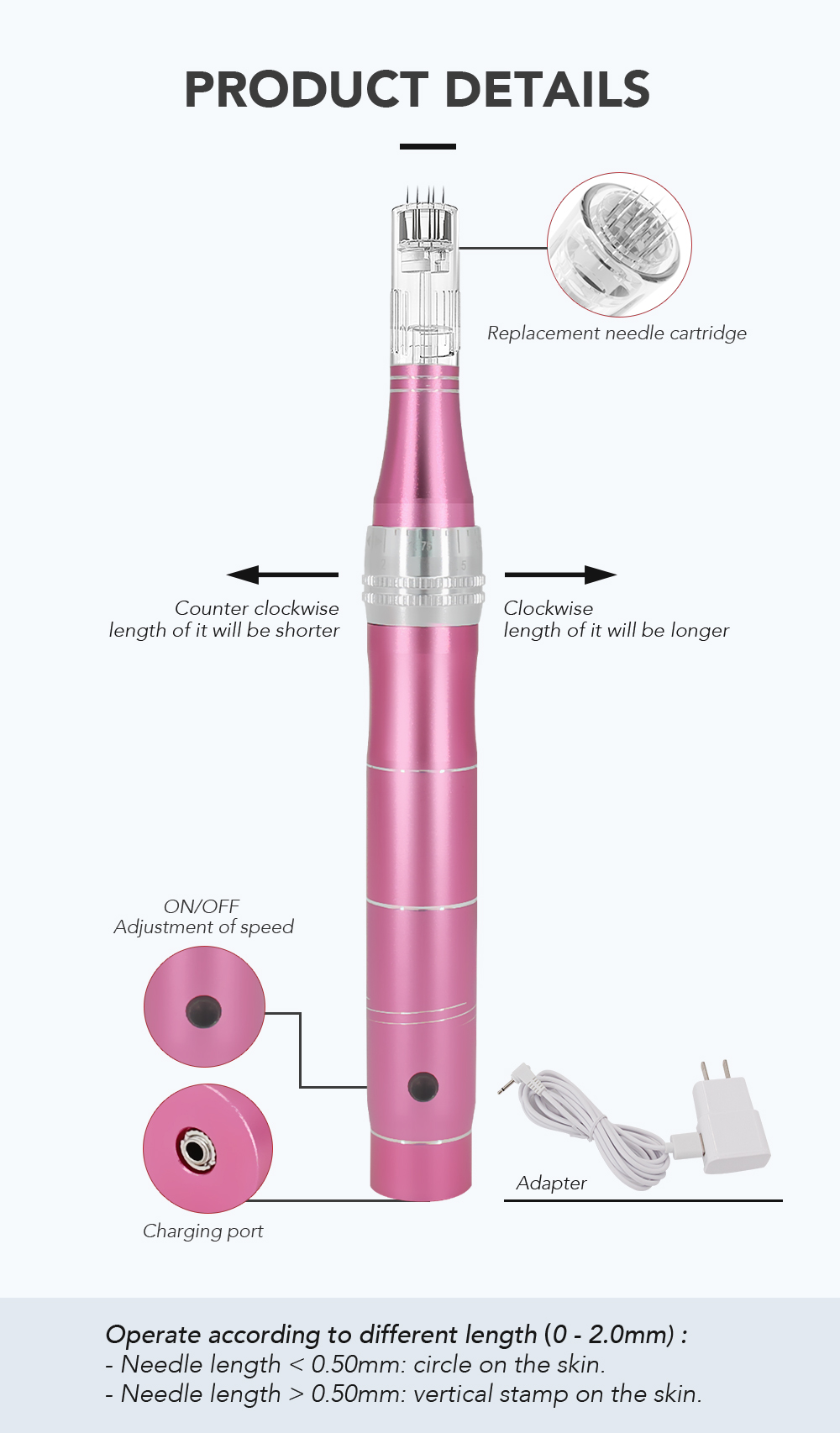 Chiều dài kim của OB-DG 05 hoạt động từ 0-2,0mm điều chỉnh và nó có thể hoạt động với các đầu kim vít 1,3,7,9,12,24,36,42,nano,3d,5d của chúng tôi cho việc điều trị mắt, môi, mũi, miệng, khuôn mặt và cơ thể.