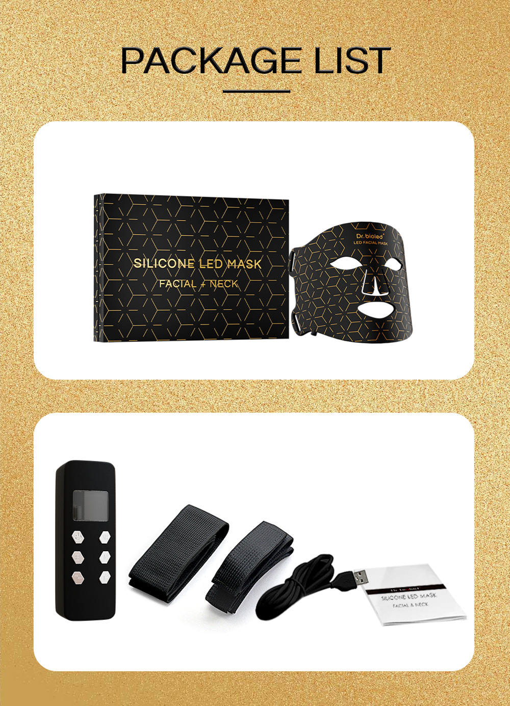 Danh sách đóng gói | 1 * Mặt nạ LED 1 * Dây nguồn 1 * Hướng dẫn sử dụng 1 * Cáp USB 2 * Dây đai |